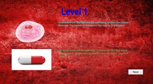 There are 3 levels and 3 different bacterias in each level. It would be a lot harder once you get to a higher level, due to an increase of speed of the bacteria. Players can kill bacterias with antidotes that is provided. there will also be a scoreboard to count how many bacterias have u killed during the game.